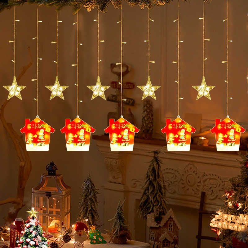 Χριστουγεννιάτικα διακοσμητικά φώτα LED τύπου κουρτίνα με σχέδιο σπιτάκια και αστέρια.
