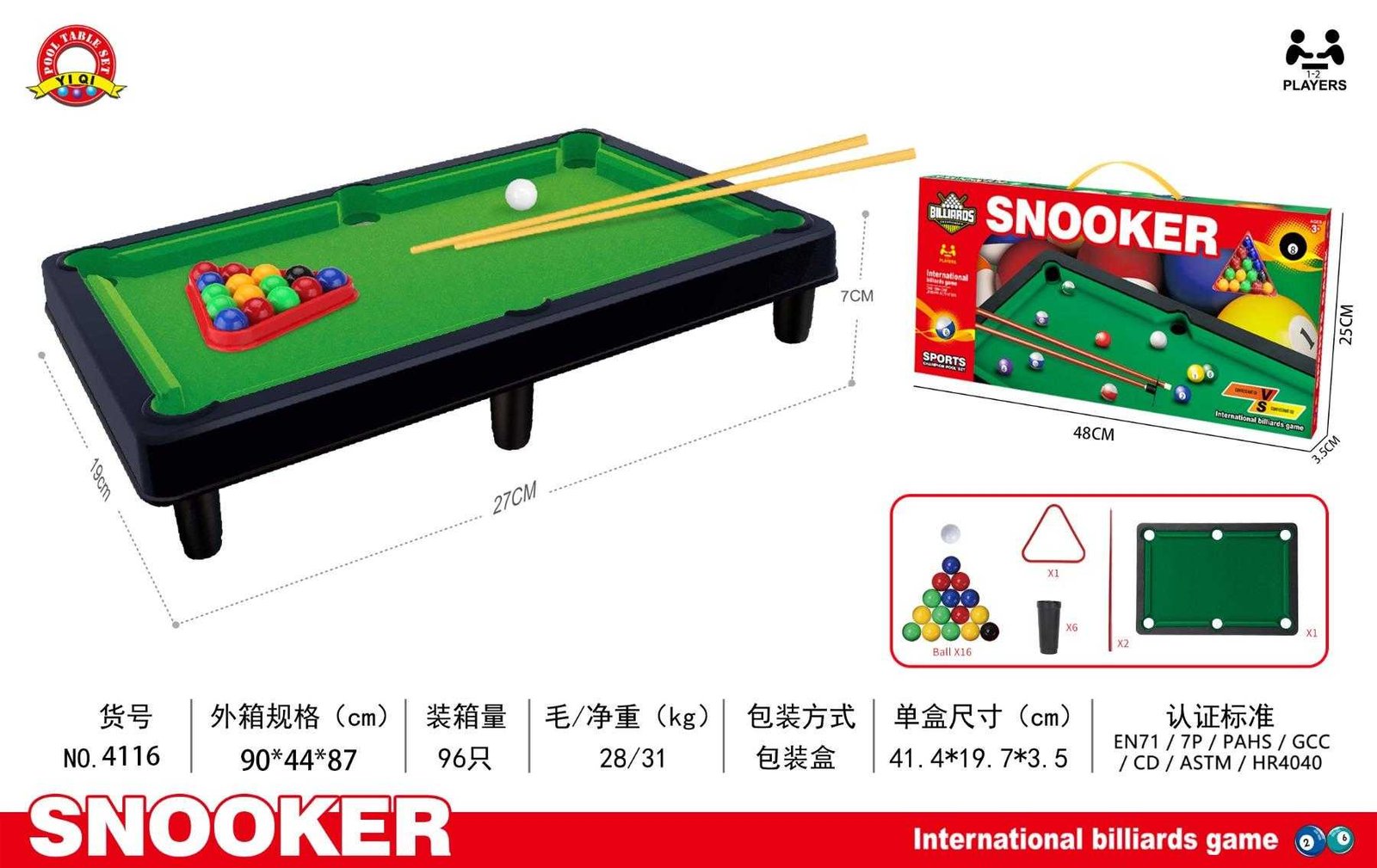 Διαστάσεις συσκευασίας: 48 x 25 x 3.5cm. Διαστάσεις μπιλιάρδου: 27 x 7 x 19cm.
