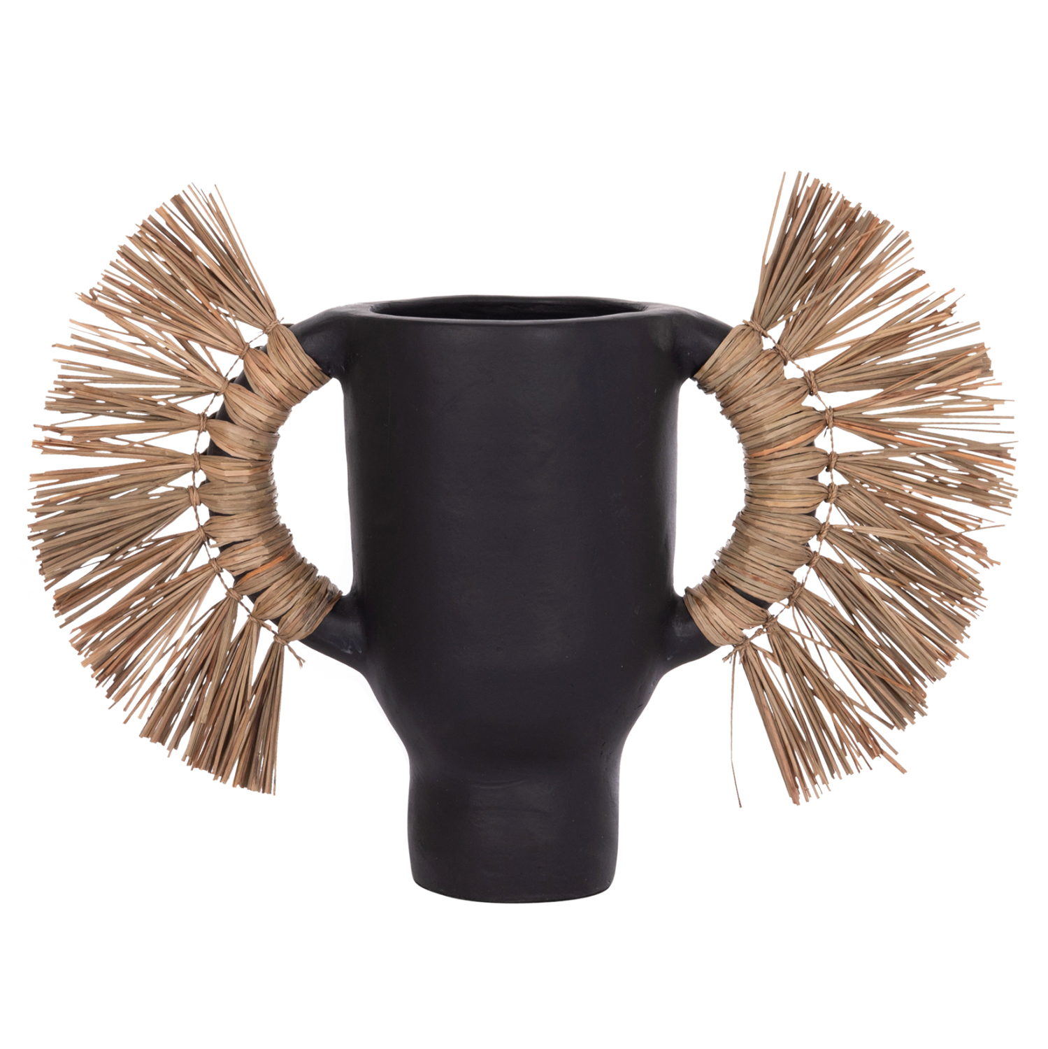 Το επιτραπέζιο χειροποίητο διακοσμητικό βάζο ALICA είναι ένα πολύ ιδιαίτερο διακοσμητικό στοιχείο για κάθε χώρο. Είναι κατασκευασμένο εξολοκλήρου από τερακότα σε ΜΑΥΡΟ χρώμα, ενώ διαθέτει και δύο χερούλια επενδυμένα με αποξηραμένο grass, και ένα σχετικά φαρδύ στόμιο.