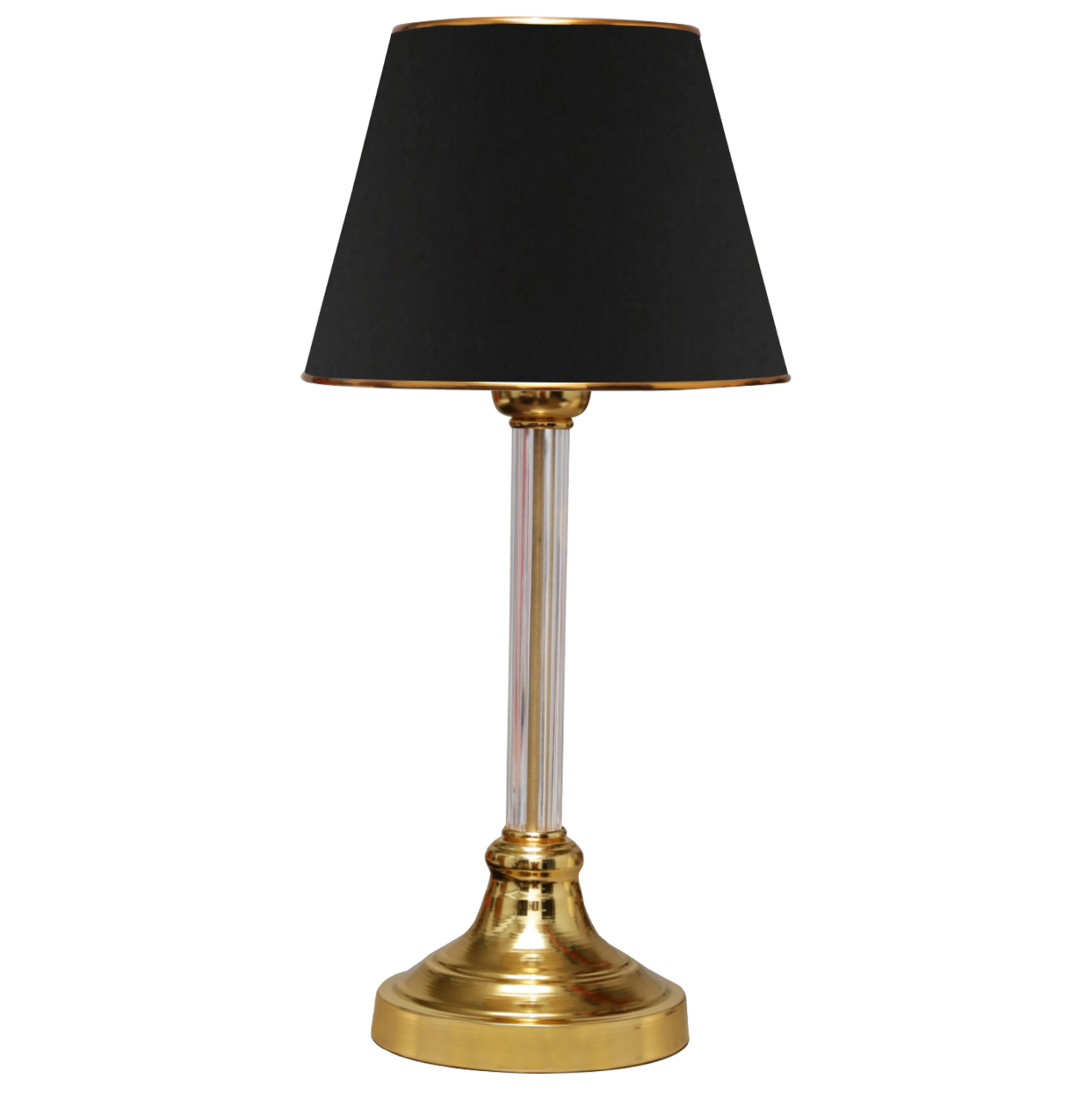 Επιτραπέζιο διακοσμητικό φωτιστικό με μονή κολώνα. Η βάση του φωτιστικού έχει καμπανοειδές σχήμα σε χρυσό γυαλιστερό χρώμα ενώ η κολώνα είναι επίσης σε χρυσό χρώμα και βρίσκεται μέσα σε πλαστικό διαφανή σωλήνα. Το «καπέλο» έχει τραπεζοειδές κυκλικό σχήμα σε μαύρο χρώμα και έχει χρυσούς δακτυλίους στις άκρες του. Το φως διαχέεται στον χώρο ευχάριστα και η αντανάκλασή του πάνω στην διάφανη κολωνίτσα του φωτιστικού αλλά και στην γυαλιστερή επιφάνεια της βάσης, παιχνιδίζει ευχάριστα στο μάτι. Αυτού του είδους τα φωτιστικά δεν προορίζονται για φωτιστικά διαβάσματος και αυτό πρέπει πάντα να λαμβάνεται υπόψη κατά την επιλογή τους. Είναι καθαρά διακοσμητικά και το ταίριασμά τους με τον περιβάλλοντα χώρο θα πρέπει να είναι αρμονικό. Αυτό το φωτιστικό είναι κομψό και βολικό σε διαστάσεις παρέχοντας αμέτρητες δυνατότητες «δεσίματος» με την υπόλοιπη διακόσμησή σας. Είναι ένα μικρό έργο τέχνης.