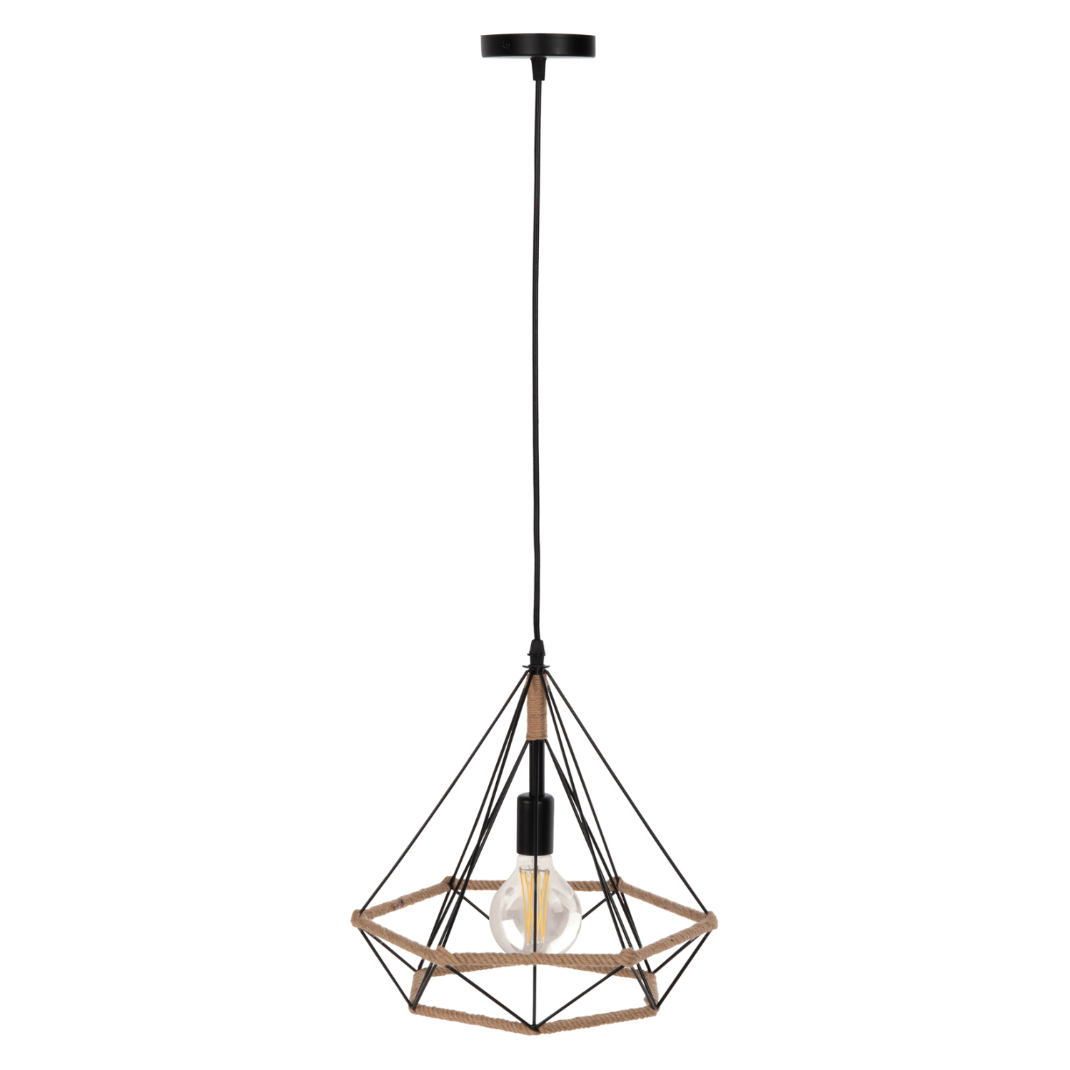 Αφήστε το φως να απλωθεί στον χώρο με ένα πρωτότυπο και φινετσάτο κρεμαστό μονόφωτο οροφής, ολοκληρώνοντας την διακόσμησή σας. Το σχήμα διαμαντιού με ΜΑΥΡΕΣ μεταλλικές ράβδους και σχοινί, είναι η επιτομή του μοντέρνου design.