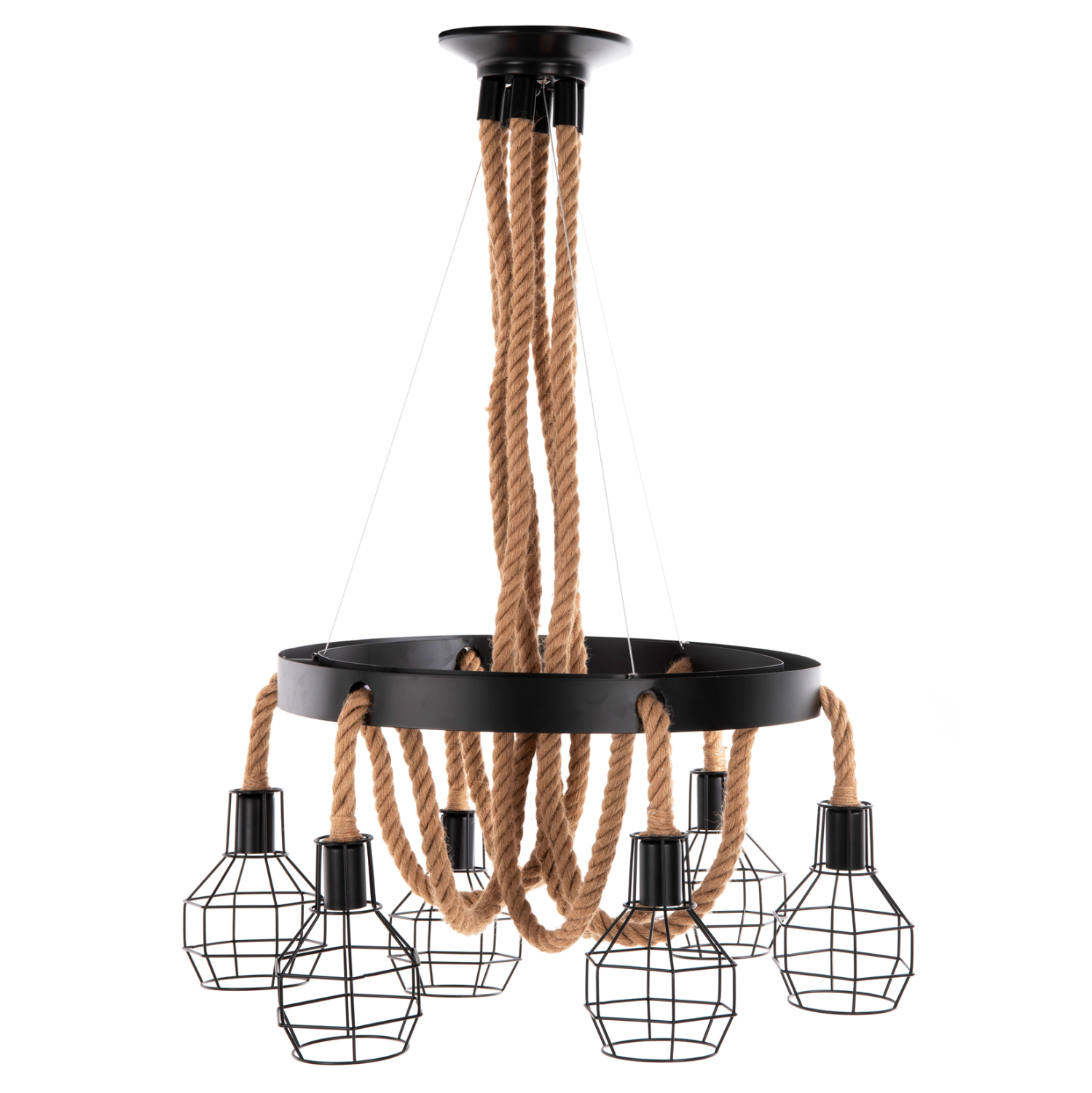 Ανακαλύψτε το νέο μας 6-φωτο κρεμαστό φωτιστικό οροφής, και μην διστάσετε να το εντάξετε στην διακόσμησή σας. Ο συνδυασμός σχοινιού και μετάλλου είναι ξεχωριστός, ενώ οι 6 λαμπτήρες σε μεταλλικούς κλωβούς θα «ρίξουν» φως σε κάθε γωνιά του δωματίου. Ιδανικό τόσο για το σπίτι, όσο και για επαγγελματικούς χώρους.