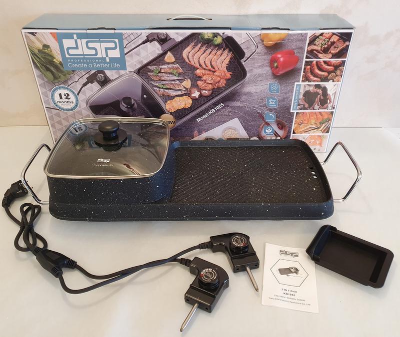 Συσκευή μαγειρέματος 2 σε 1 της DSP με Grill-Barbeque και ενσωματωμένη κατσαρόλα 2 τμημάτων με καπάκι. Μία επαναστατική πολυλειτουργική συσκευή που θα σας λύσει τα χέρια καθώς σας επιτρέπει να μαγειρεύετε εύκολα, γρήγορα και οικονομικά έως και 3 παρασκευές ταυτόχρονα χωρίς την χρήση πολλών σκευών και εστιών κουζίνας.