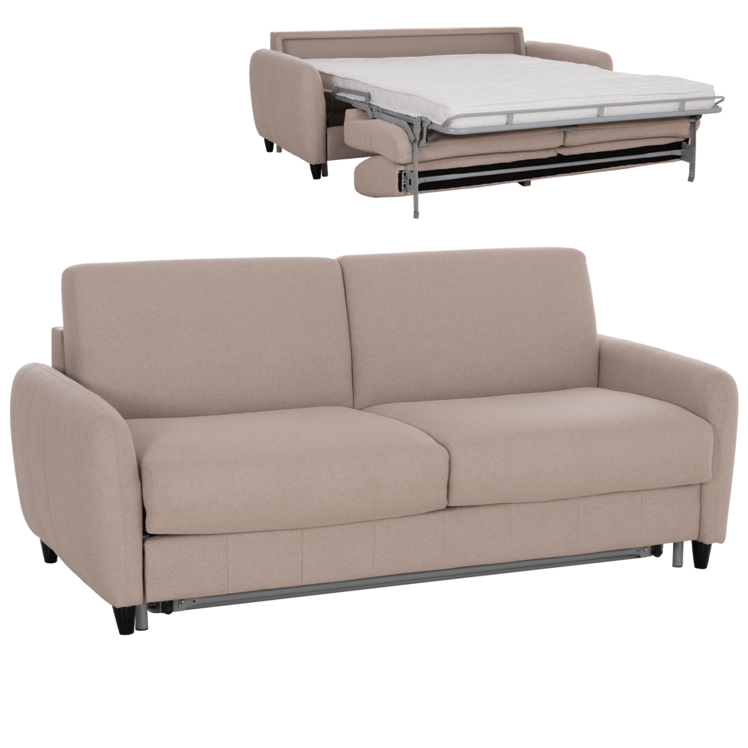 Ο διθέσιος καναπές κρεβάτι ETUDINE είναι μια κομψή και απολύτως λειτουργική επιλογή για κάθε μοντέρνο σπίτι. Η ΜΠΕΖ υφασμάτινη επένδυση, τα στρογγυλεμένα λεπτά μπράτσα και τα διακριτικά μαύρα ποδαράκια προσδίδουν μια καθαρή, minimal αισθητική, ενώ ο ενσωματωμένος μηχανισμός μετατροπής σε κρεβάτι τον καθιστά ιδανικό τόσο για καθημερινή χρήση όσο και για φιλοξενούμενους.