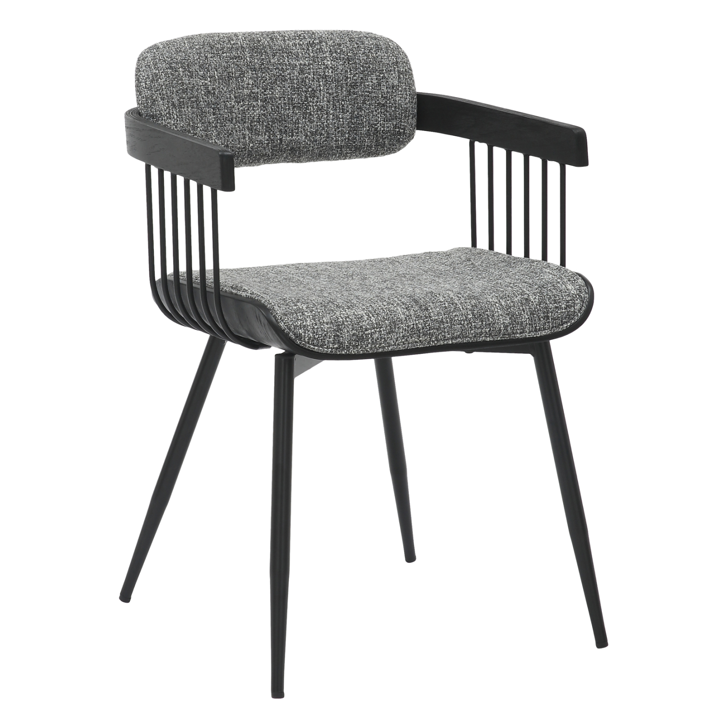 Η καρέκλα τραπεζαρίας LANG διαθέτει μεταλλικό σκελετό σε ΜΑΥΡΟ χρώμα ενώ το κάθισμα και η μίνιμαλ πλάτη είναι επενδυμένα με ποιοτικό ύφασμα σε ΓΚΡΙ χρώμα. Η βάση τόσο της πλάτης όσο και του καθίσματος είναι κατασκευασμένα από ποιοτικό κόντρα-πλακέ θαλάσσης, όπως και η ράγα στο επάνω μέρος των μπράτσων που δίνει μια διαφορετική «πινελιά» στην όμορφη αυτή καρέκλα.