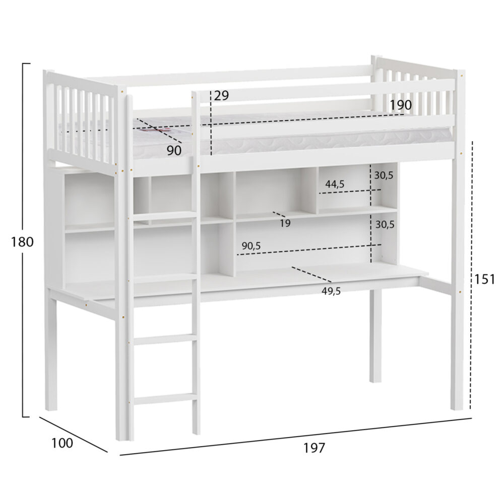 Η παιδική κουκέτα LIBRO σε διάσταση για στρώμα 90×190εκ, είναι κατασκευασμένη από ξύλο πεύκου σε ΛΕΥΚΟ χρώμα. Η πρόσβαση στο κρεβάτι γίνεται με πρακτική κάθετη σκάλα, ενώ το κάτω μέρος είναι διαμορφωμένο ως βιβλιοθήκη με χώρο για γραφείο. Το στρώμα τοποθετείται σε τάβλες από κόντρα-πλακέ ξυλεία.