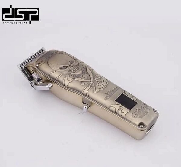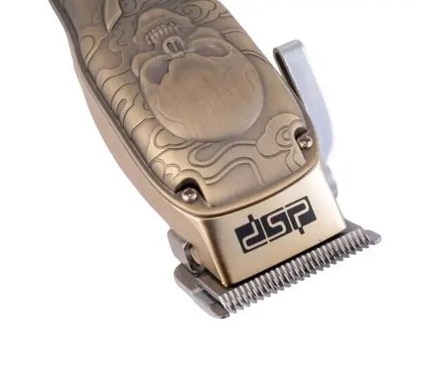 Επαναφορτιζόμενη κουρευτική και ξυριστική μηχανή της DSP, σε εντυπωσιακό μεταλλικό design με ανάγλυφα σχέδια. Με μεγάλη αυτονομία μπαταρίας και λεπίδες κατασκευασμένες από ανοξείδωτο ατσάλι. Κατάλληλη για χρήση από επαγγελματίες Barbers.