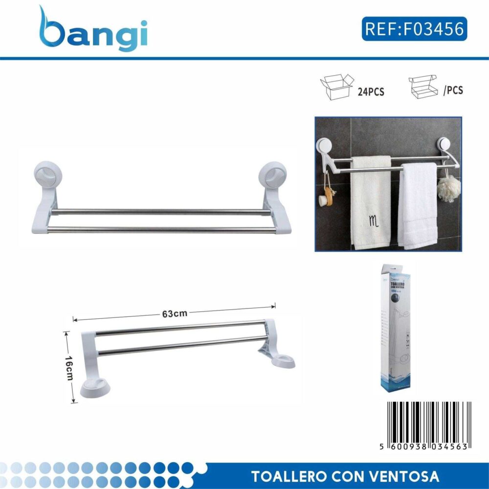 Κρεμάστρα πετσέτας μπάνιου με μεταλλική ράγα inox και πλαστικές βάσεις υψηλής ανθεκτικότητας. Εύκολη τοποθέτηση με ισχυρές βεντούζες, χωρίς να απαιτείται βίδωμα.