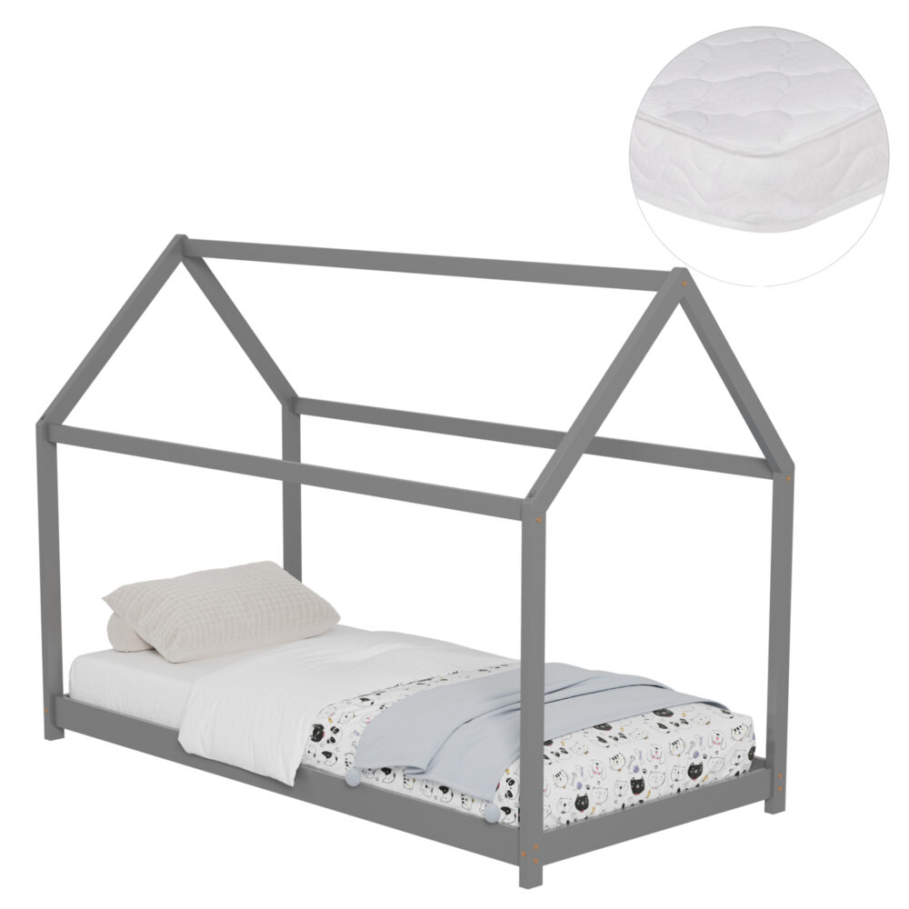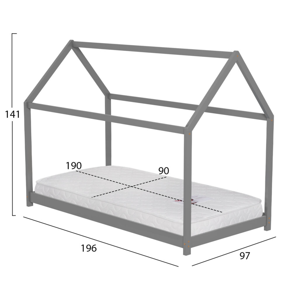 Το παιδικό κρεβάτι PEPE τύπου Montessori σε διάσταση για στρώμα 90×190εκ, είναι κατασκευασμένο από ξύλο πεύκου σε ΓΚΡΙ χρώμα. Όλο το κρεβάτι έχει σχήμα σπιτιού με εξαιρετικά χαμηλά πόδια, ενώ το στρώμα τοποθετείται σε τάβλες από κόντρα-πλακέ ξυλεία.