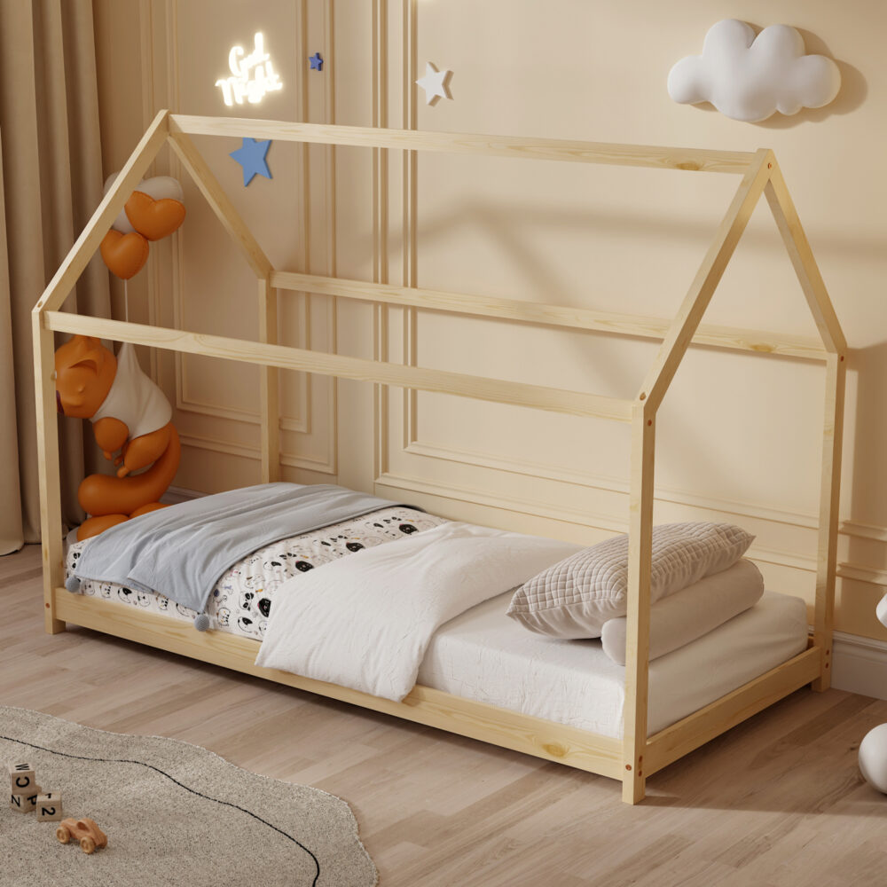 Το παιδικό κρεβάτι PEPE τύπου Montessori σε διάσταση για στρώμα 90×190εκ, είναι κατασκευασμένο από ξύλο πεύκου σε ΦΥΣΙΚΟ χρώμα. Όλο το κρεβάτι έχει σχήμα σπιτιού με εξαιρετικά χαμηλά πόδια, ενώ το στρώμα τοποθετείται σε τάβλες από κόντρα-πλακέ ξυλεία.