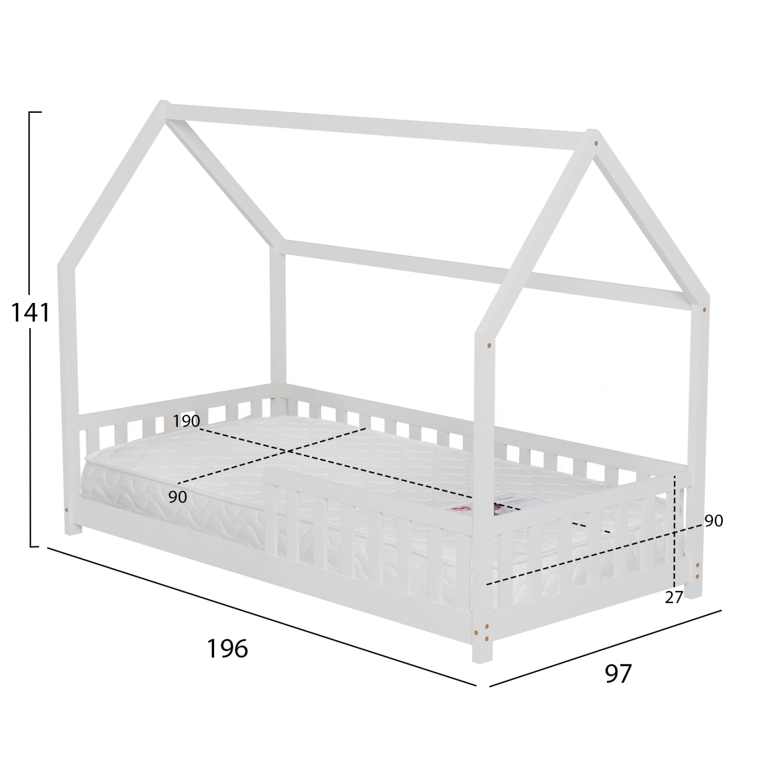 Το παιδικό κρεβάτι PHYLLIS τύπου Montessori σε διάσταση για στρώμα 90×190εκ, είναι κατασκευασμένο από ξύλο πεύκου σε ΛΕΥΚΟ χρώμα. Όλο το κρεβάτι έχει σχήμα σπιτιού με εξαιρετικά χαμηλά πόδια και περιμετρικά κάγκελα, ενώ το στρώμα τοποθετείται σε τάβλες από κόντρα-πλακέ ξυλεία.