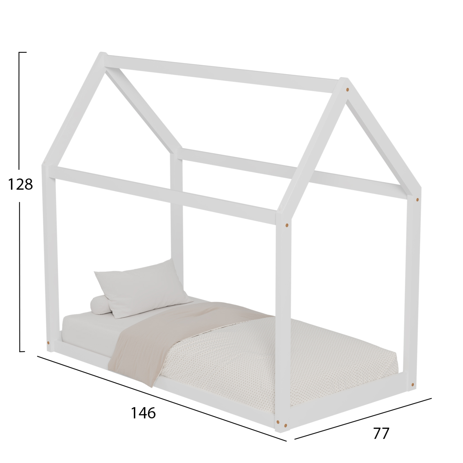 Σας παρουσιάζουμε το καινούργιο παιδικό κρεβάτι PEPE. Είναι μικρό για στρώμα 70×140 εκ, και αποτελεί μια άριστης ποιότητας, μοντέρνα και ασφαλή επιλογή για το παιδικό δωμάτιο τύπου Montessori, που σημαίνει ότι έχει σχεδιαστεί σύμφωνα με το εκπαιδευτικό σύστημα Montessori, σύμφωνα με το οποίο τα παιδιά μαθαίνουν καλύτερα, όταν επιλέγουν μόνα τους τι θα κάνουν. Το χαμηλό ύψος κρεβατιού χωρίς πόδια, βοηθά να εξερευνούν την αυτονομία τους και να ανεβοκατεβαίνουν από το κρεβάτι τους ελεύθερα ανά πάσα στιγμή. Είναι ξύλινο σε ΛΕΥΚΟ χρώμα βαμμένο με αβλαβές βερνίκι με βάση το νερό και μη τοξικό, ιδανικό για παιδιά. Το στρώμα τοποθετείται σε τάβλες κατασκευασμένες από ξυλεία κόντρα πλακέ. Ολόκληρο το κρεβάτι έχει σχήμα σπιτιού που θα δώσει μια ευχάριστη, «ζεστή», και παιχνιδιάρικη όψη σε κάθε παιδικό δωμάτιο.