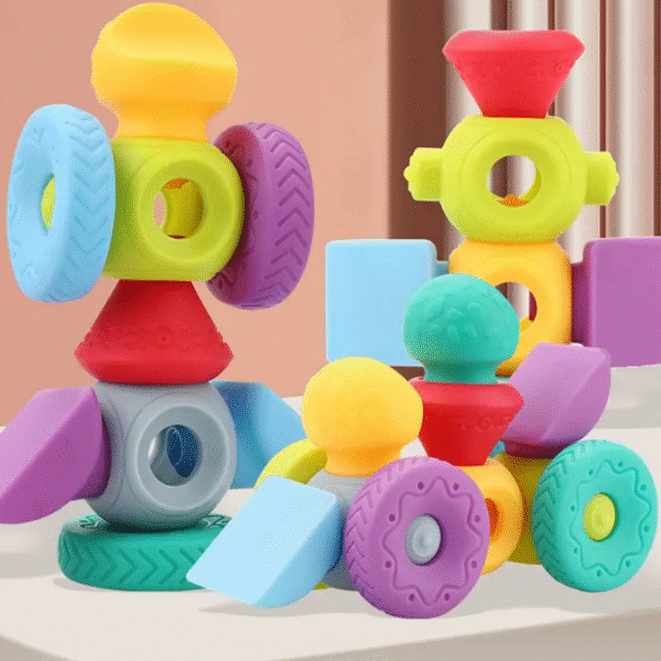 Παιχνίδι κατασκευών DIY με πολύχρωμα τουβλάκια από ειδικό μαλακό καουτσούκ, μη τοξικό, σε διάφορα γεωμετρικά σχήματα για απίθανες δημιουργίες.