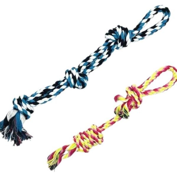 Παιχνίδι σκύλου σχοινί με κόμπους, από ανθεκτικό, μη τοξικό υλικό, ιδανικό για παιχνίδια τραβήγματος/αντίστασης ενώ παράλληλα βοηθά στην υγιεινή στόματος του σκύλου σας καθώς καθαρίζει ήπια και απασχολεί τα δόντια του. Συνολικό μήκος: 60cm.