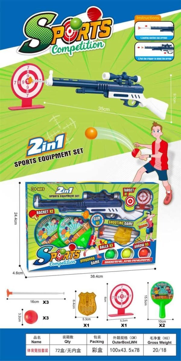 Παιχνίδι παιχνίδι 2 σε 1 με στόχο και όπλο με βέλη-βεντούζες ενώ διαθέτει και σετ με mini ρακέτες με 3 μπαλάκια Ping Pong.