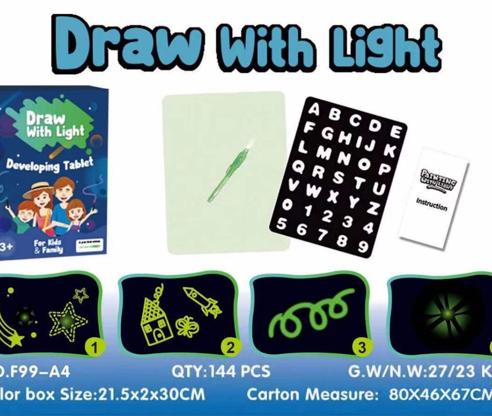 2. Πάρτε ένα ειδικό tablet με επίστρωση που συσσωρεύει φως, με δείκτη φακού και ξεκινήστε να σχεδιάζετε! Από το άγγιγμα του “πινέλου” στον “καμβά” θα υπάρχουν φωτεινές γραμμές, η φωτεινότητα και η διαύγεια των οποίων εξαρτάται από την απόσταση από το δείκτη έως το tablet και τη γωνία κλίσης. Δεν μπορείτε να σβήσετε από την επιφάνεια εργασίας, αλλά μπορείτε να σχεδιάσετε στην κορυφή, καθώς κάθε νέα γραμμή θα είναι φωτεινότερη από την προηγούμενη. Εντελώς η ίδια εικόνα εξαφανίζεται σε 30-40 λεπτά.