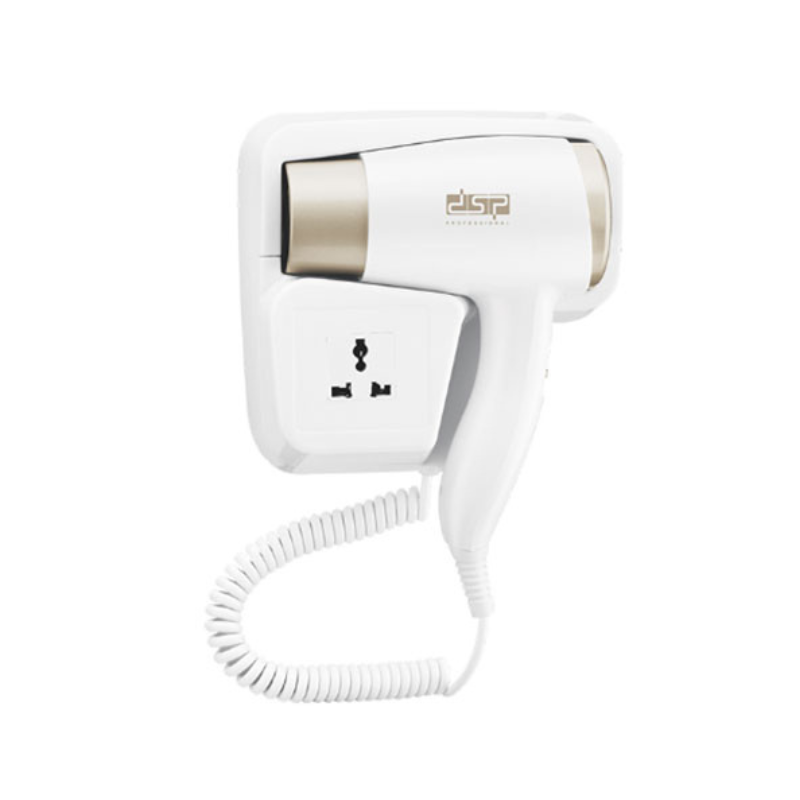 Πιστολάκι μαλλιών DSP με επιτοίχια εγκατάσταση και ενσωματωμένη πρίζα ρεύματος για παράλληλη σύνδεση άλλων ηλεκτρικών συσκευών, ειδικά σχεδιασμένο για ξενοδοχειακές μονάδες.