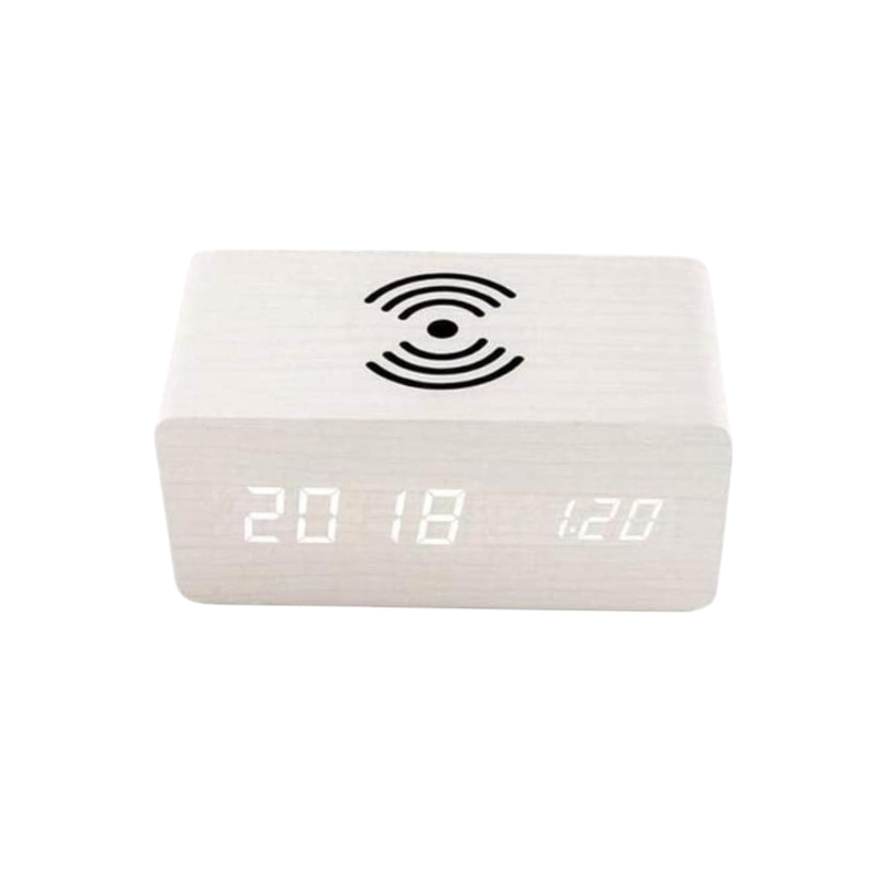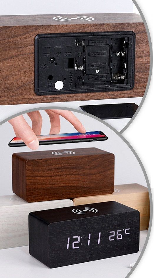 Ψηφιακό ρολόι–Ξυπνητήρι LED, με βάση ασύρματης φόρτισης smartphone, σε ιδιαίτερο σχεδιασμό με εφέ ξύλου.