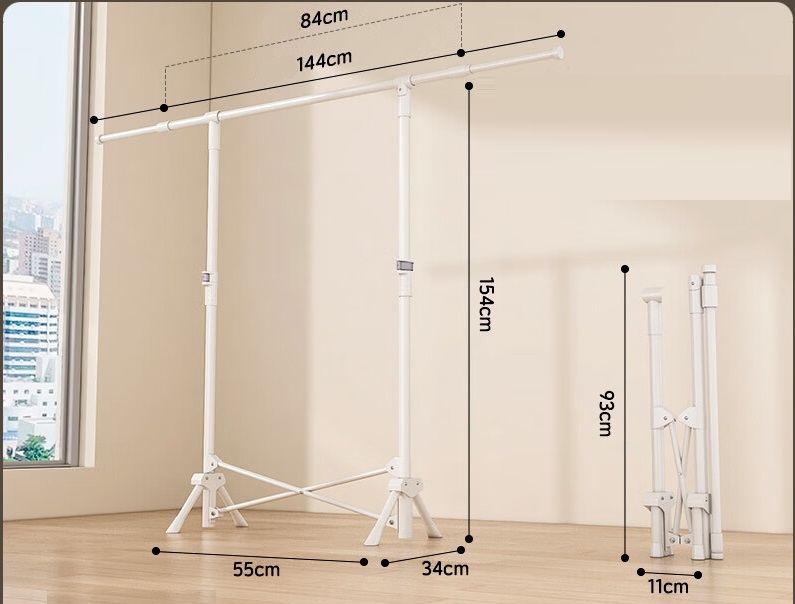 Πτυσσόμενη κρεμάστρα δαπέδου και απλώστρα ρούχων πολλαπλών χρήσεων, με μεταλλικό σκελετό και εργονομικό σχεδιασμό που αναδιπλώνεται για εξαιρετικά εύκολη αποθήκευση και μεταφορά χωρίς να καταλαμβάνει χώρο.