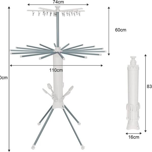 Πτυσσόμενη κρεμάστρα δαπέδου και απλώστρα ρούχων πολλαπλών χρήσεων, με μεταλλικό σκελετό, βάσεις παπουτσιών, κλιπς/μανταλάκια μικρών ρούχων και ροδάκια μετακίνησης.