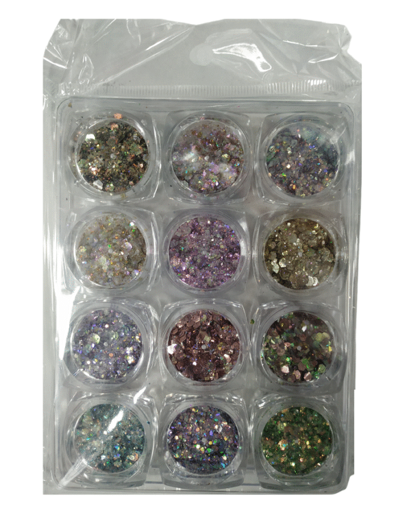 Σετ Glitter νυχιών Nail Art, 12 διαφορετικών χρωμάτων, σε ενιαία πρακτική παλέτα.