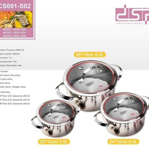 Σετ μαγειρικά σκεύη υψηλής ποιότητας κατασκευής από την DSP, κατασκευασμένα από ανοξείδωτο ατσάλι, με γυάλινο καπάκι.