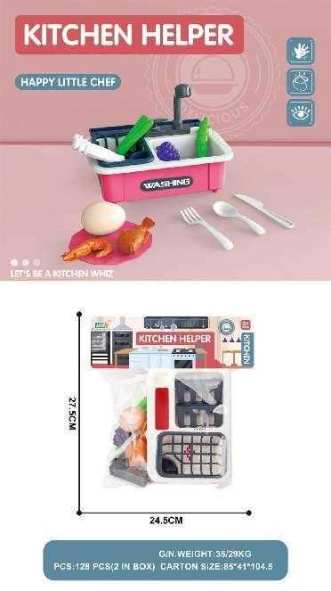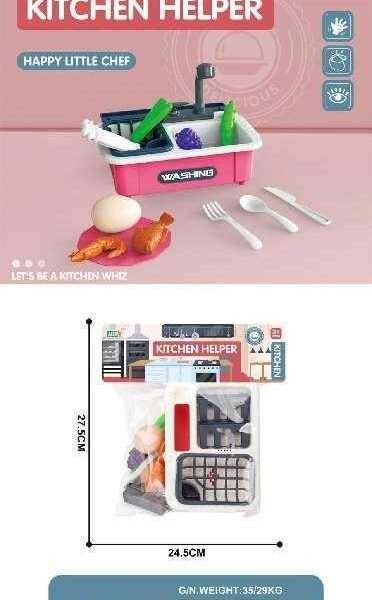 Παιχνίδι νεροχύτης κουζίνας με αξεσουάρ σκεύη και τρόφιμα, σε υπέροχο πολύχρωμο σχεδιασμό.