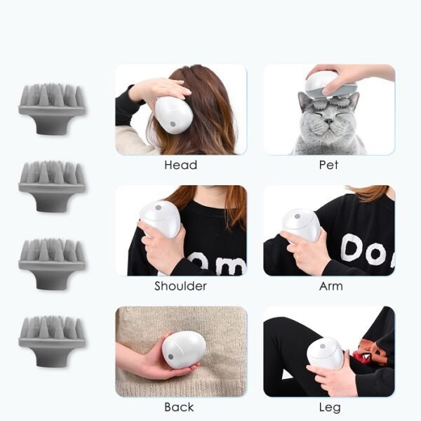 Συσκευή μασάζ κεφαλής με 4 μαλακά άκρα σιλικόνης που κινούνται κυκλικά και προσφέρουν μια απίστευτη αίσθηση χαλάρωσης με πολλές ευεργετικές ιδιότητες Ιδιότητες: Βελτιώνει την κυκλοφορία του αίματος, ανακουφίζει από πονοκεφάλους, πιάσιμο και ενοχλήσεις ενώ βοηθά στην γρήγορη και υγιή ανάπτυξη των μαλλιών σας. Είναι επαναφορτιζόμενη για άνετη ασύρματη χρήση. Μπορεί να χρησιμοποιηθεί σε βρεγμένο δέρμα καθώς οι κεφαλές τις είναι αδιάβροχες ενώ αφαιρούνται και πλένονται. Μπορεί ακόμη να χρησιμοποιηθεί και στο υπόλοιπο σώμα για ήπιο μασαζ ή και στο κατοικίδιό σας.