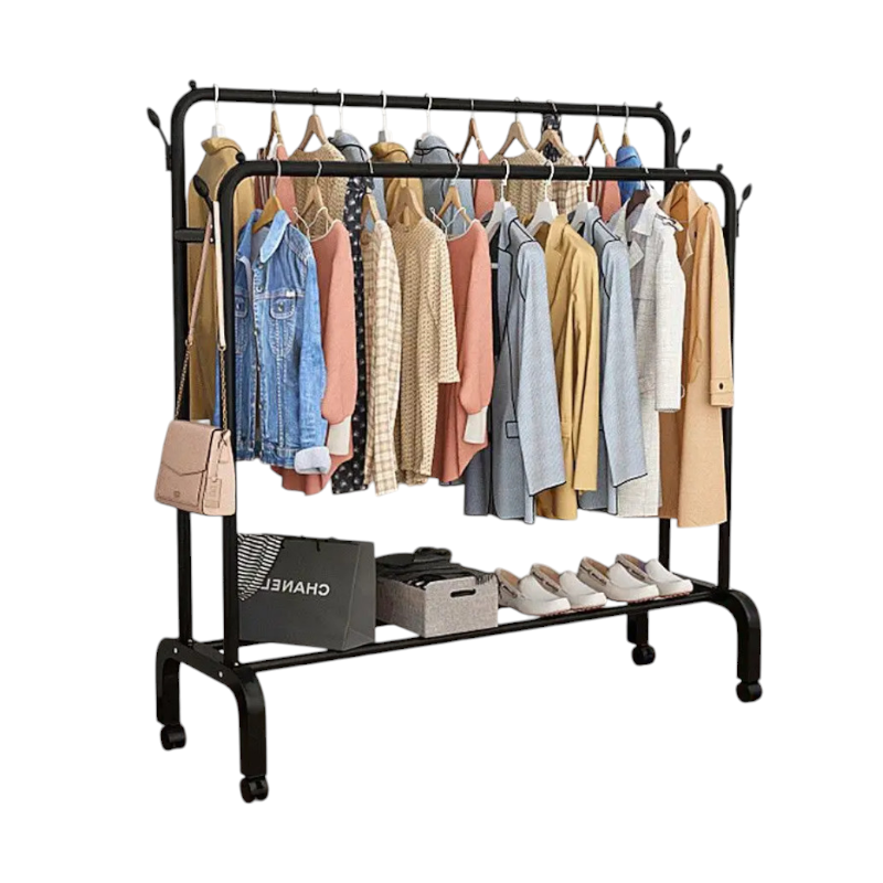 Τροχήλατη κρεμάστρα δαπέδου διπλή, μεταλλική, με ράφι παπουτσιών και πλαϊνές κρεμάστρες, ιδανική ως έπιπλο εισόδου ή για την οργάνωση των ρούχων στο δωμάτιό σας.