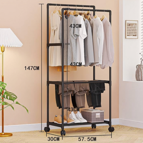 Τροχήλατη κρεμάστρα δαπέδου διπλή με 2 ράφια πολλαπλών χρήσεων, ιδανική ως έπιπλο εισόδου ή για την οργάνωση των ρούχων στο δωμάτιό σας .