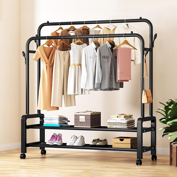 Τροχήλατη κρεμάστρα δαπέδου μεταλλική, με 2 ράφια παπουτσιών και πλαϊνές κρεμάστρες, ιδανική ως έπιπλο εισόδου ή για την οργάνωση των ρούχων στο δωμάτιό σας.